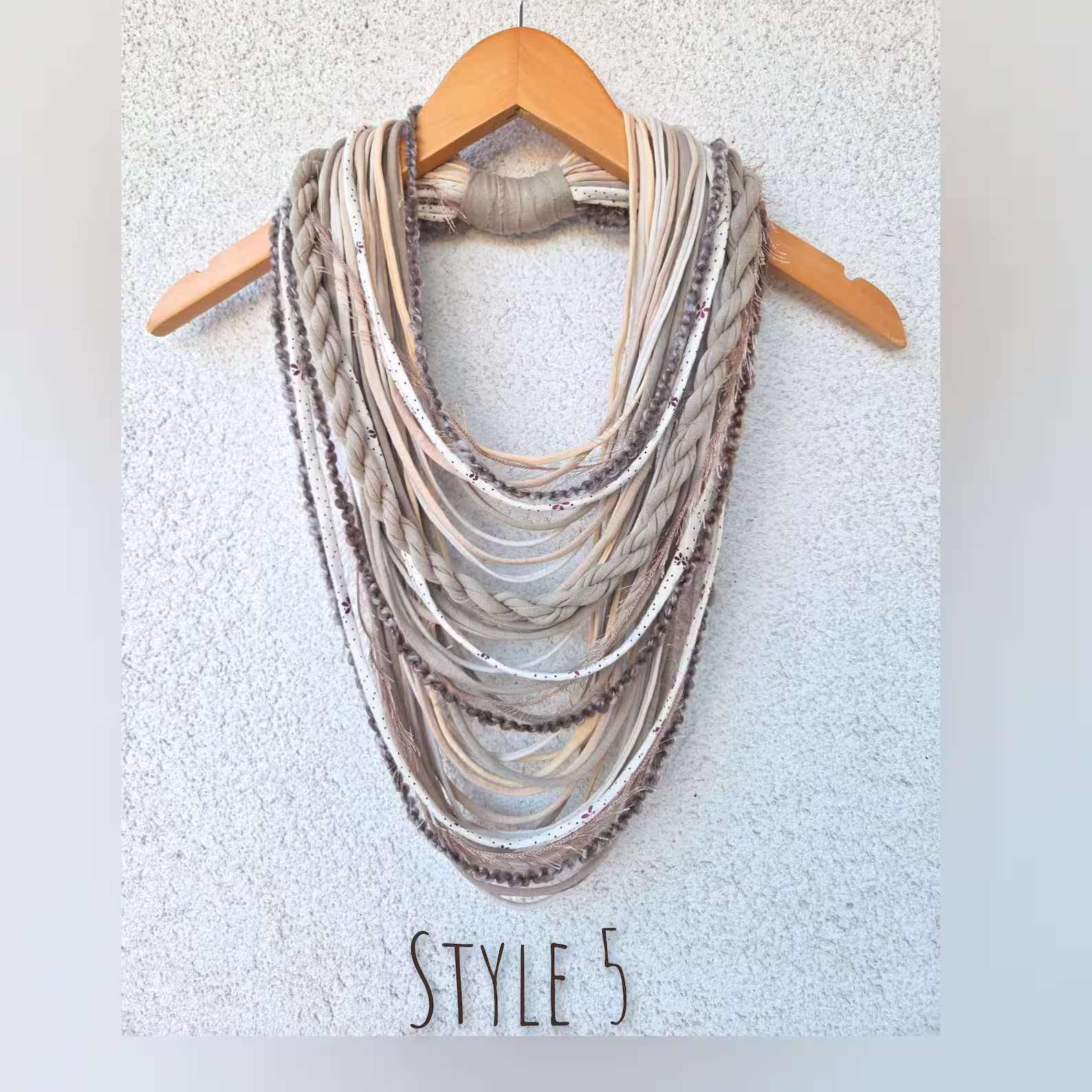 Boho Scarf Necklace Bohemian Style Accessoires. Extravagant oversized scarf necklace in brown, earthy shades. Made from 80% recycled cotton, 20% other carefuly selected fabric and yarn. Unusual and unique. This piece will make you very fashionable and bring any clothing to life. Will make even a simple shirt or dress an excellent garment. FUN TO WEAR by Unikatina – Unique, unusual handmade fabric scarf neckalce – Possible to make orders by your own specification.